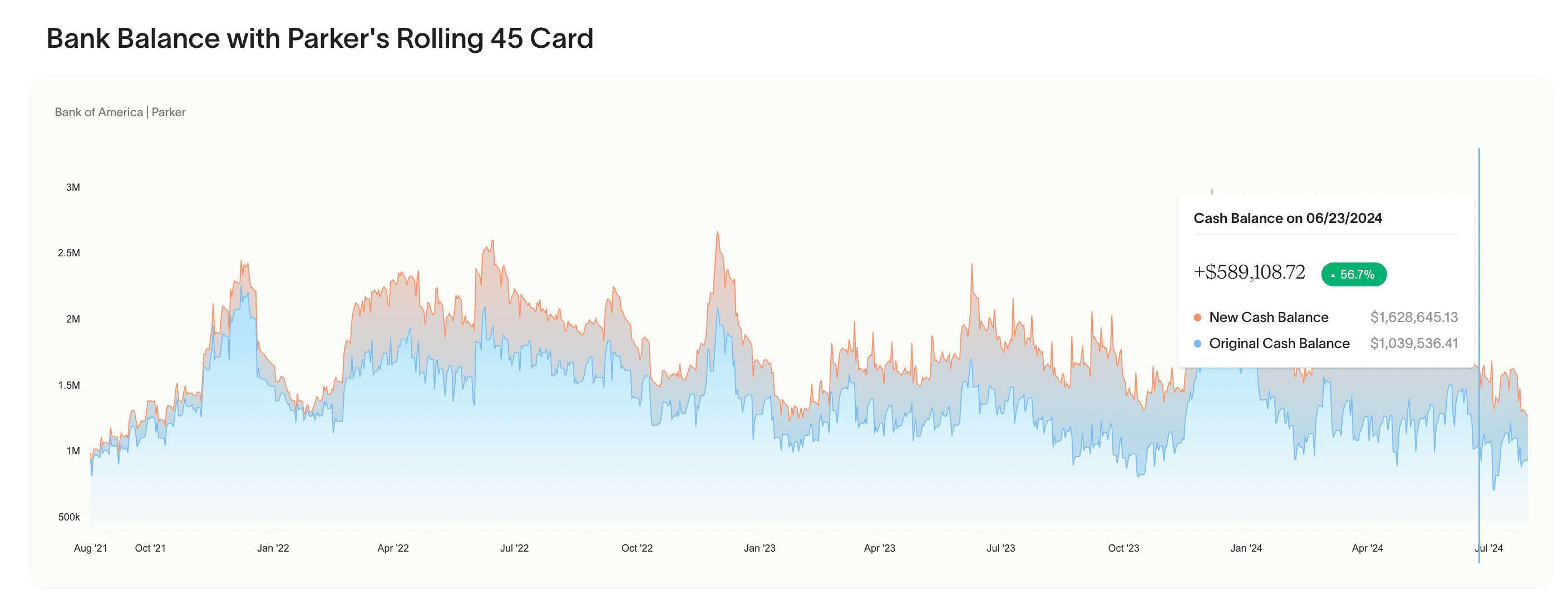 Most folks gravitate towards the longer duration part of our pitch. 45, 60, and 90 days of float sounds nice. But rolling terms provide value over and above just extending cash flow. With rolling terms, your cash balance actually grows!
